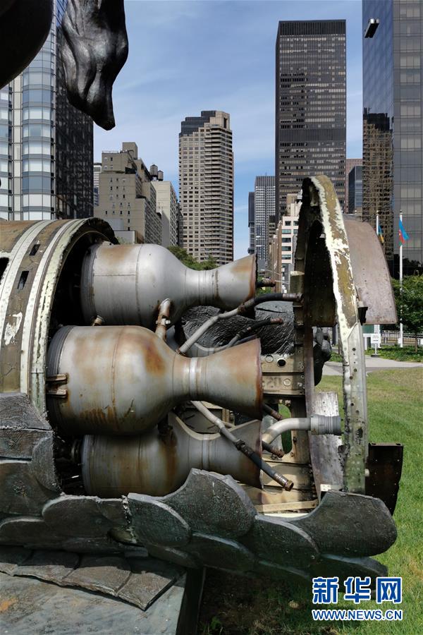 这是8月5日在位于纽约的联合国总部拍摄的“善战胜恶”雕塑局部。新华社记者 李木子 摄