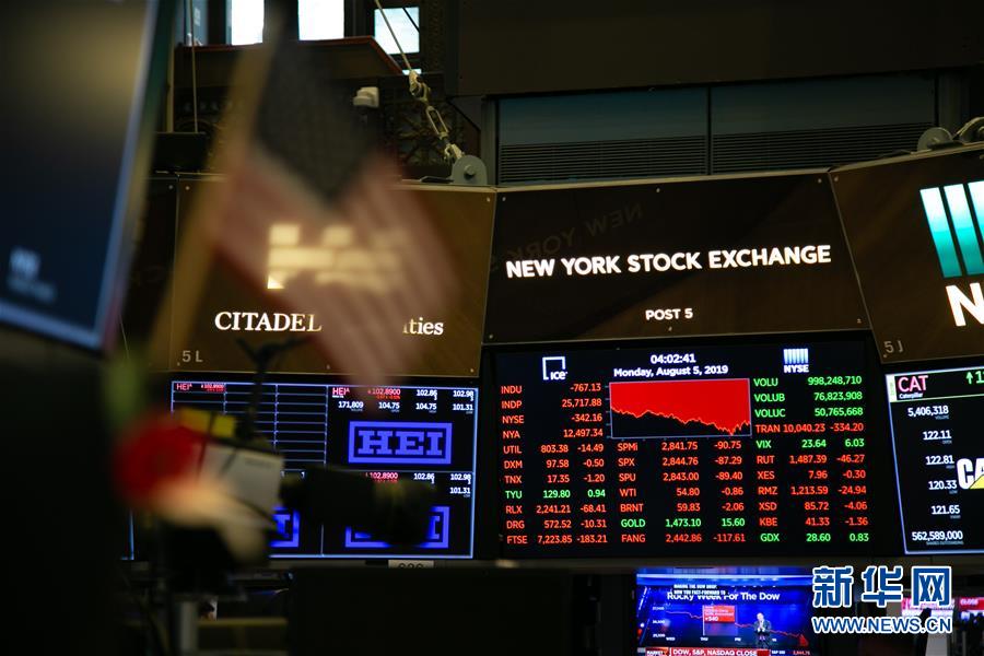 8月5日,在美国纽约证券交易所,电子屏显示当天交易情况。 当日,美国三大股指均创下年内最大跌幅。截至当天收盘,道琼斯工业平均指数比前一交易日下跌767.27点,收于25717.74点,跌幅为2.90%。标准普尔500种股票指数下跌87.31点,收于2844.74点,跌幅为2.98%。纳斯达克综合指数下跌278.03点,收于7726.04点,跌幅为3.47%。 新华社记者 郭沛然 摄