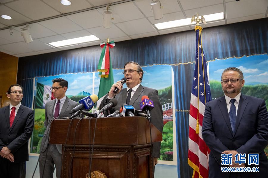 8月5日,在美国得克萨斯州埃尔帕索的墨西哥驻埃尔帕索领事馆,墨西哥外长埃布拉德(左三)在记者会上讲话。 新华社记者 王迎 摄