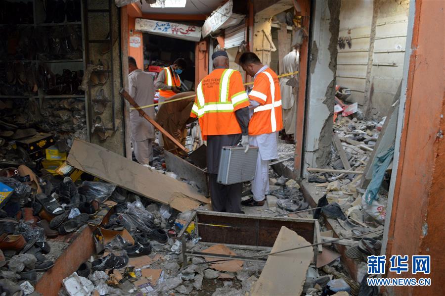 8月6日,在巴基斯坦奎达,救援人员在爆炸现场工作。 巴基斯坦西南部俾路支省首府奎达6日发生一起爆炸事件,造成2人死亡,另有6人受伤。 新华社发(伊尔凡 摄)