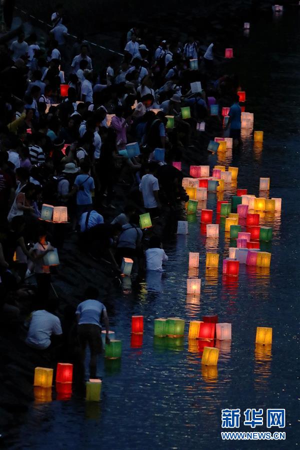 8月6日,在日本广岛和平纪念公园,民众以放河灯的方式,悼念逝者、呼唤和平。 当日是日本广岛原子弹轰炸74周年。广岛民众参与多项活动,悼念受原子弹轰炸影响的死难者,呼唤和平。 新华社记者 杜潇逸 摄