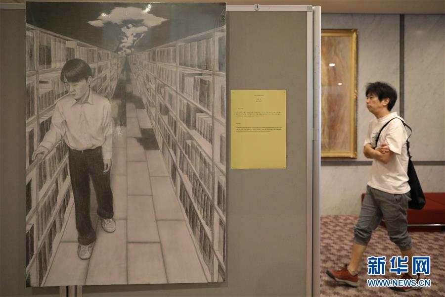8月6日,在日本广岛和平纪念公园,民众欣赏当地中学生以和平为主题的画作。 当日是日本广岛原子弹轰炸74周年。广岛民众参与多项活动,悼念受原子弹轰炸影响的死难者,呼唤和平。 新华社记者 杜潇逸 摄