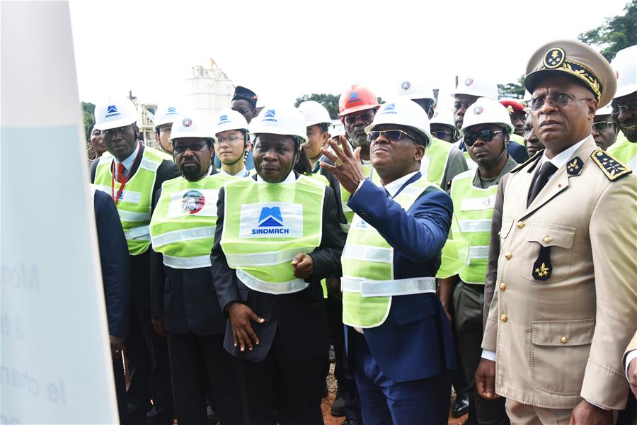 8月7日,在喀麦隆首都雅温得,喀麦隆总理恩古特(蓝色西装)参观由中国机械工业集团有限公司承建的萨纳加饮用水处理厂项目。新华社发(让·皮埃尔·科普索摄)