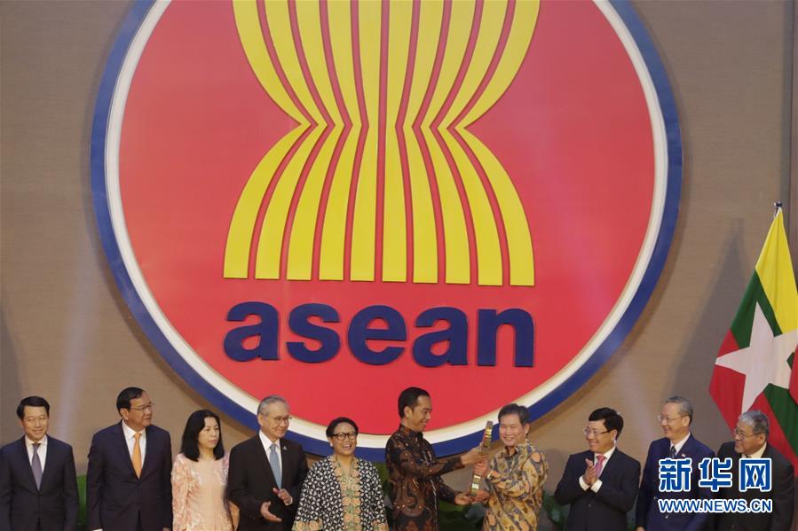 8月8日,在印度尼西亚首都雅加达的东盟秘书处新大楼落成典礼上,印尼总统佐科(右五)向东盟秘书长林玉辉(右四)交接新大楼象征性钥匙。 当日,东南亚国家联盟(东盟)秘书处新大楼落成典礼在印尼首都雅加达举行,印尼总统佐科主持典礼。当天也是东盟成立52周年纪念日。 新华社发(印度尼西亚外交部供图)