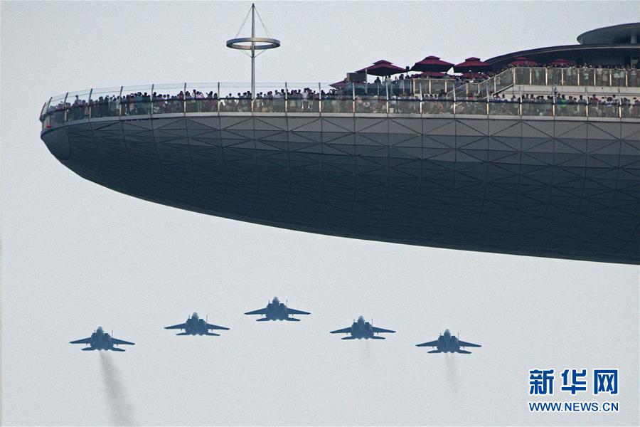 8月9日,五架新加坡空军部队战斗机在新加坡政府大厦前大草场举行的国庆庆典上空飞行。 新加坡9日在政府大厦前大草场举行国庆54周年庆典。由于今年适逢新加坡开埠200周年,庆典围绕回顾历史、携手共创未来的主题,将国庆气氛推向高潮。 新华社发(邓智炜 摄)