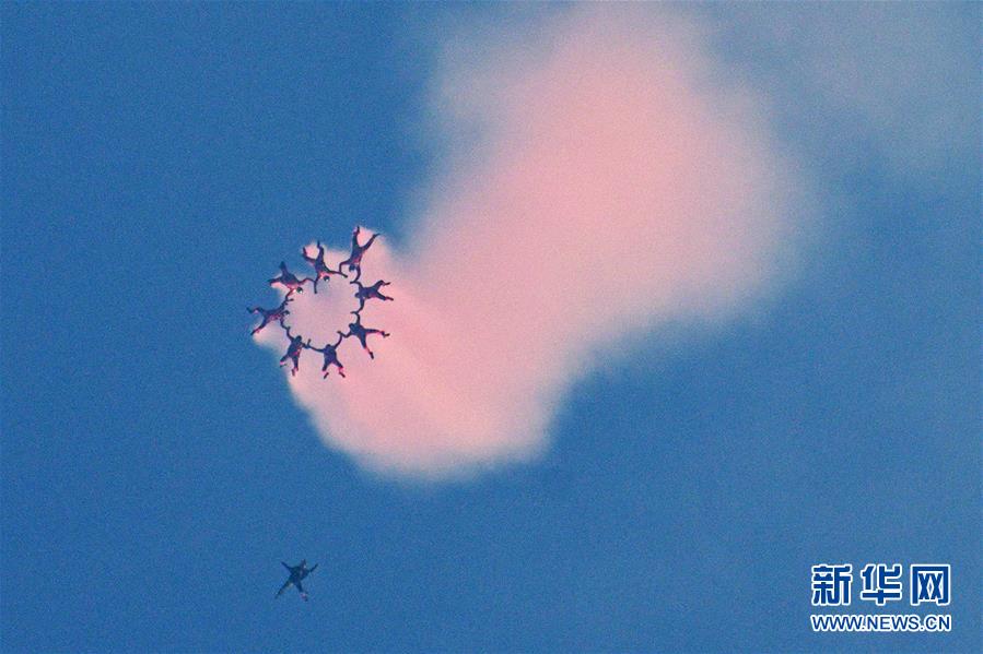 8月9日,新加坡武装部队红狮跳伞员在新加坡政府大厦前大草场举行的国庆庆典从天而降。 新加坡9日在政府大厦前大草场举行国庆54周年庆典。由于今年适逢新加坡开埠200周年,庆典围绕回顾历史、携手共创未来的主题,将国庆气氛推向高潮。 新华社发(邓智炜 摄)
