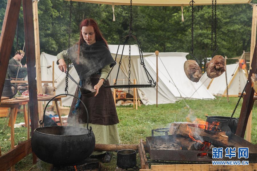 8月10日,在比利时布永,一名女子在中世纪风情节上准备食物。 当日,一年一度的中世纪风情节在比利时南部小城布永举行。异彩纷呈的仿古生活场景再现、重装武士决斗、古生活体验等活动吸引了众多游客前来“穿越中世纪”。 新华社记者 郑焕松 摄