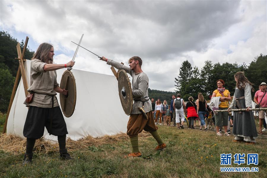 8月10日,在比利时布永,两名男子在中世纪风情节上展示剑术格斗。 当日,一年一度的中世纪风情节在比利时南部小城布永举行。异彩纷呈的仿古生活场景再现、重装武士决斗、古生活体验等活动吸引了众多游客前来“穿越中世纪”。 新华社记者 郑焕松 摄