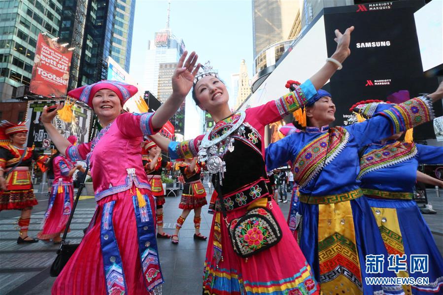 8月10日,在美国纽约时报广场,人们穿着中国少数民族服装演唱山歌。 当日,纽约当地广西社团组织“乡音播全球 山歌颂中华”活动,100多名华侨华人和外国友人欢聚一堂,将《山歌好比春江水》《多谢了》等中国民歌唱响纽约时报广场。 新华社发(谷新楠 摄)