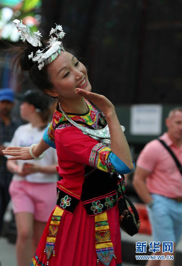 8月10日,在美国纽约时报广场,一名身穿中国少数民族服装的女子演唱山歌。 当日,纽约当地广西社团组织“乡音播全球 山歌颂中华”活动,100多名华侨华人和外国友人欢聚一堂,将《山歌好比春江水》《多谢了》等中国民歌唱响纽约时报广场。 新华社发(谷新楠 摄)