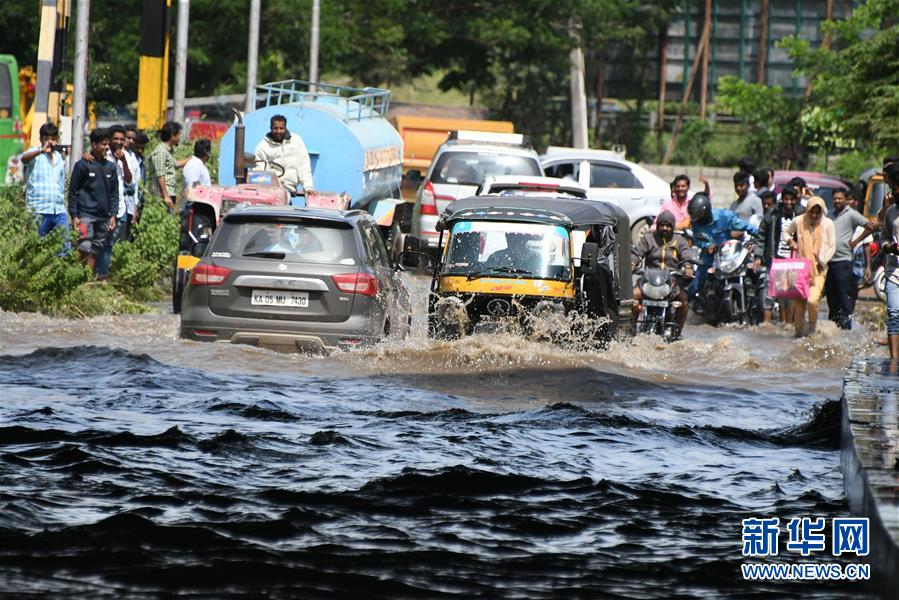 8月11日,在印度卡纳塔克邦门迪亚区,行人和车辆通过积水的道路。 据印度媒体11日报道,近日印度西海岸多地持续暴雨引发洪灾和山体滑坡,造成的死亡人数已上升至132人,另有多人失踪。 新华社发(卡希夫·马苏德摄)