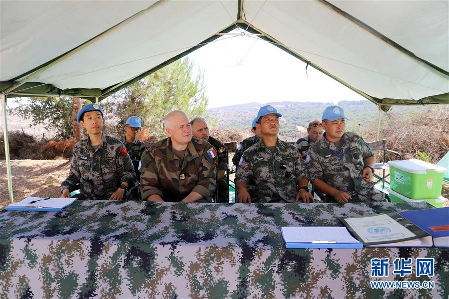 8月9日,在位于黎巴嫩南部与以色列边境“蓝线”地域的一片雷场,联合国驻黎巴嫩临时部队(联黎部队)新任作战部长、法国上校德勒维耶·德莫尼(前左二)视察中国官兵扫雷工作。 现阶段,中国第18批赴黎维和部队多功能工兵分队正在清排该区域的一片雷场。 新华社发(孙帅摄)