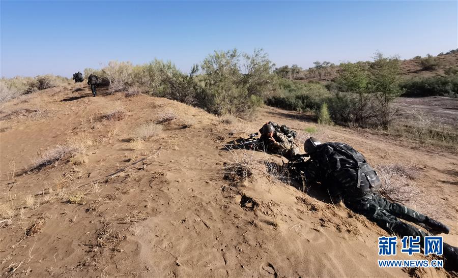 在中吉“合作-2019”联合反恐演练沙漠追剿战斗综合演练中,中吉双方特战队员混合编组进行搜索(8月11日摄)。 新华社记者 刘芳 摄