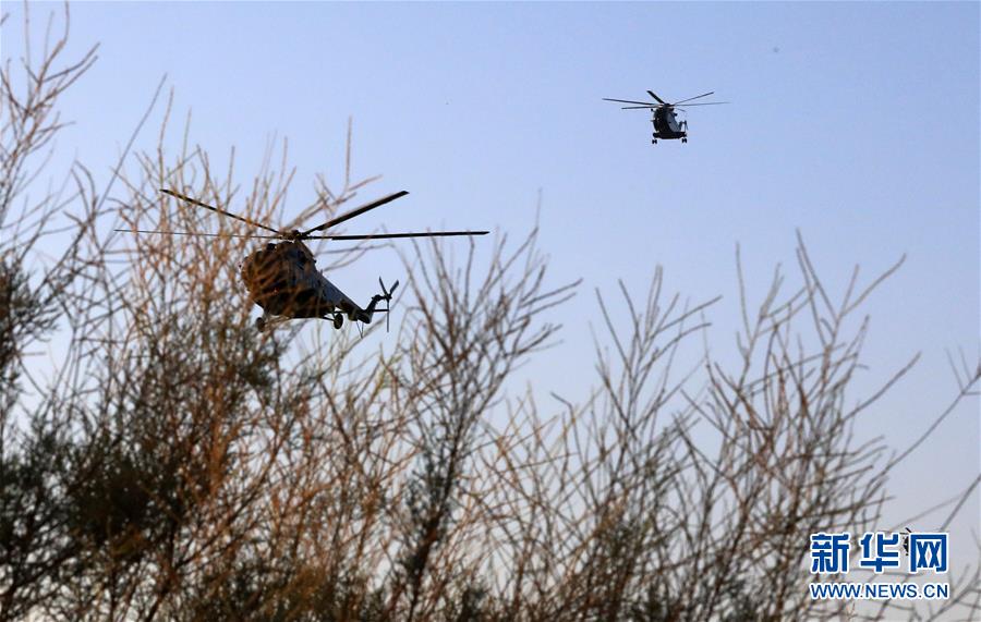 在中吉“合作-2019”联合反恐演练沙漠追剿战斗综合演练中,搭载特战队员的直升机抵达索降点(8月11日摄)。 新华社记者 刘芳 摄