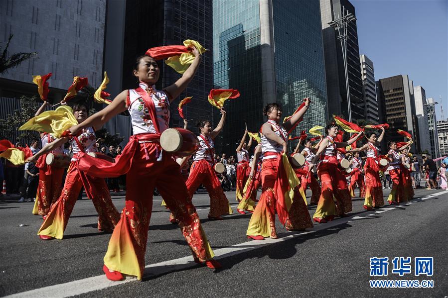 8月11日,腰鼓队在巴西圣保罗市保利斯塔大街上表演。 “《我和我的祖国》中华文化快闪活动”11日在巴西圣保罗市保利斯塔大街举行。百余名华侨华人和巴西民众观看了演出。 新华社发(拉赫尔·帕特拉索摄