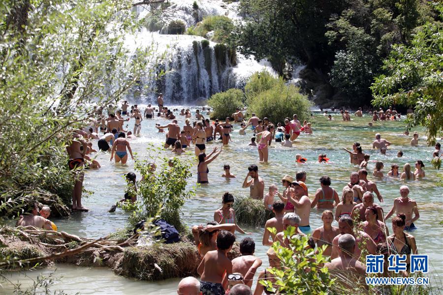 8月12日,在克罗地亚南部斯克拉丁附近的克尔卡国家公园,人们在水中消暑。 克罗地亚近日迎来新一轮高温天气。 新华社发(内尔·帕夫莱蒂奇摄)
