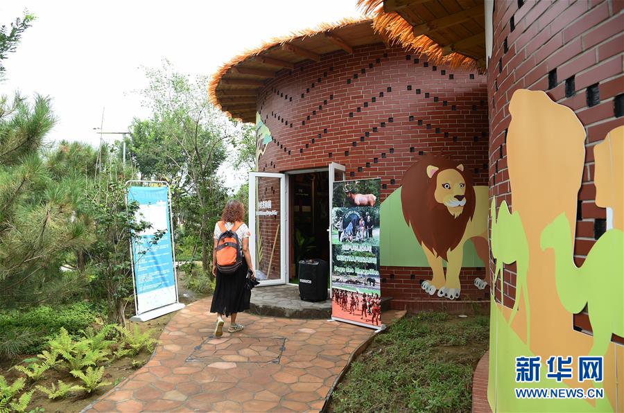 8月13日,游客在位于中非联合展园中的中非共和国展区参观。 当日,2019年中国北京世界园艺博览会“中非共和国国家日”活动在北京世园会园区举行。 新华社发(任超 摄)