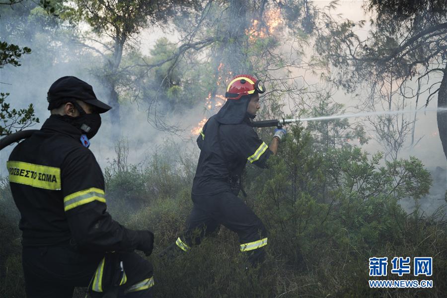 8月13日,在希腊中部埃维亚岛的马克里马利村附近,消防员奋力灭火。 埃维亚岛13日凌晨发生森林火灾,火势迅速蔓延。目前已有数百名居民被疏散,当地已宣布进入紧急状态。 新华社发(尼克·帕莱奥洛戈斯摄)