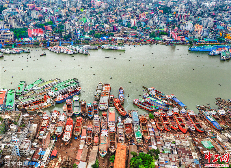 孟加拉达卡港口停满彩色船只 与岸边建筑融为一体难以区分