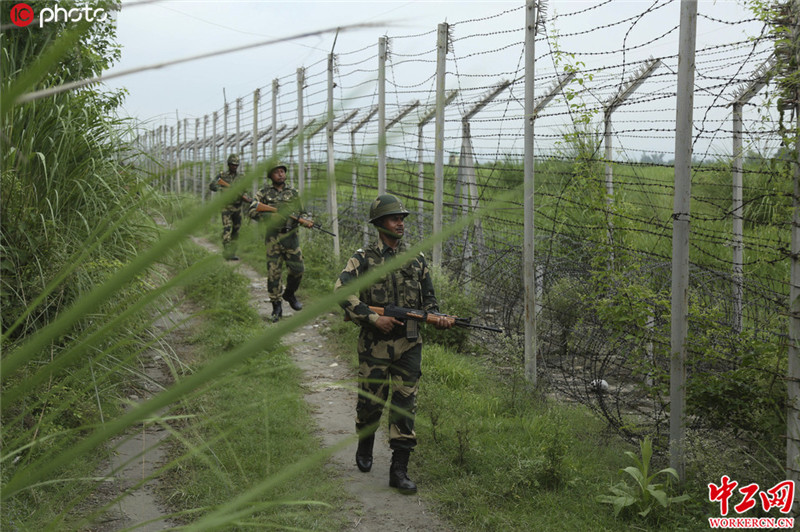 当地时间2019年8月13日,印巴边境地带,印度边境安全部队士兵在查谟-克什米尔邦约35公里的Akhnoor边境围栏一带巡逻。图片署名: ap/IC photo