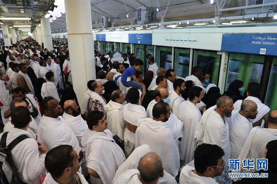 8月11日,在沙特阿拉伯麦加,朝觐者在站台上等候乘坐轻轨列车。新华社发(董立巍摄)