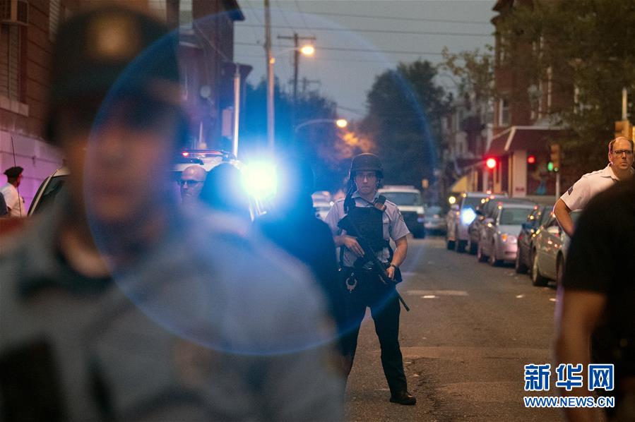 8月14日,在美国宾夕法尼亚州费城,警察在枪击案现场周边维持秩序。新华社/美联