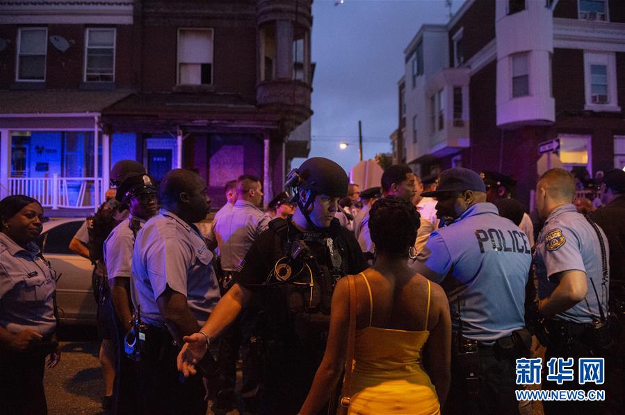 8月14日,在美国宾夕法尼亚州费城,警察在枪击案现场附近维持秩序。新华社/美联
