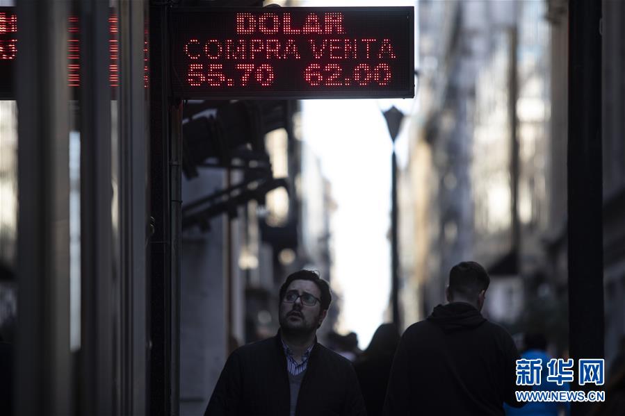 8月14日,在阿根廷首都布宜诺斯艾利斯,行人经过一处货币兑换点。新华社发(马丁·萨巴拉摄)