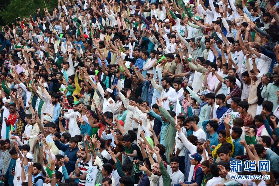 8月14日,在巴基斯坦东部边境的瓦格赫口岸,巴基斯坦民众观看降旗仪式。新华社发