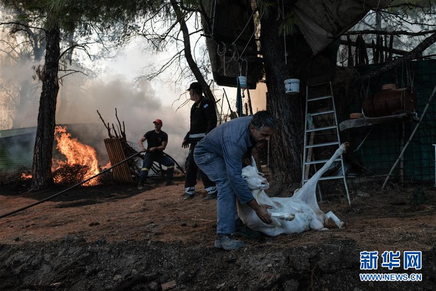 8月14日,在希腊埃维亚岛马克里马利村附近,消防员和志愿者参与山火疏散救援。新华社发(尼克·帕莱奥洛戈斯摄)