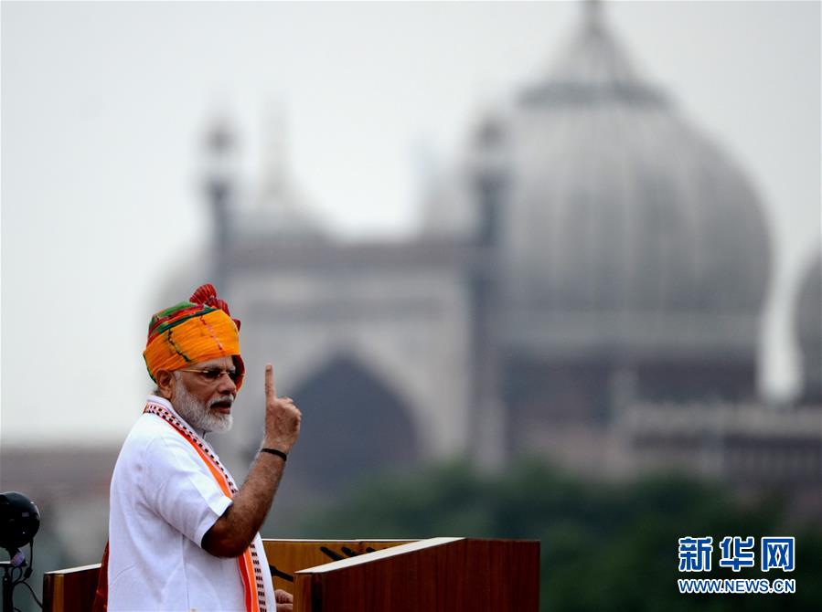 8月15日,在印度新德里,印度总理莫迪在独立日庆祝活动上讲话。 新华社发(帕塔·萨卡尔摄)