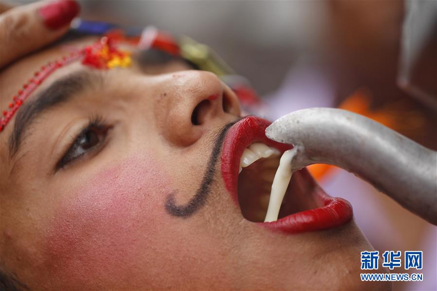 8月16日,在尼泊尔加德满都,一名男孩在参加神牛节游行时饮用牛奶。新华社发(苏拉韦尔·什雷斯塔摄)