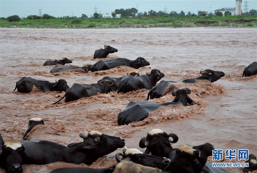 8月17日,在印控克什米尔查谟郊外,牛群穿过涨水的的达维河。 印控克什米尔地区受每年6月至9月的季风雨季影响,雷电暴雨天气频发,洪水及泥石流等灾害经常发生。 新华社发