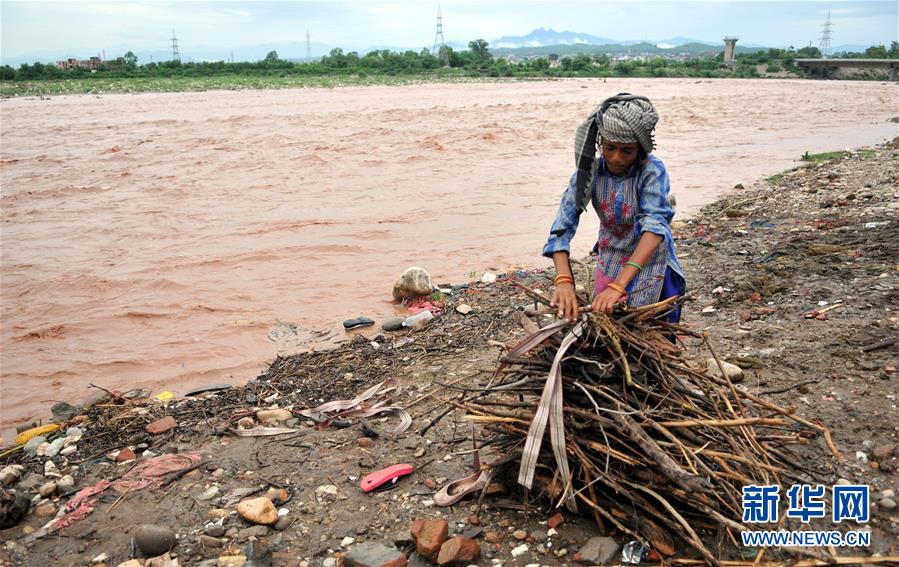 8月17日,在印控克什米尔查谟郊外,一个女孩在涨水的达维河岸收集木柴。 印控克什米尔地区受每年6月至9月的季风雨季影响,雷电暴雨天气频发,洪水及泥石流等灾害经常发生。 新华社发