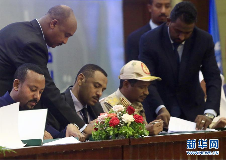 8月17日,在苏丹喀土穆,苏丹过渡军事委员会副主席穆罕默德·哈姆丹·达克卢(中右)和“自由与变革联盟”主要领导成员艾哈迈德·拉比(中左)共同签署政治文件。 苏丹过渡军事委员会与主要反对派“自由与变革联盟”17日在首都喀土穆正式签署“政治宣言”和“宪法宣言”等政治文件。 新华社发(穆罕默德·海德尔摄)
