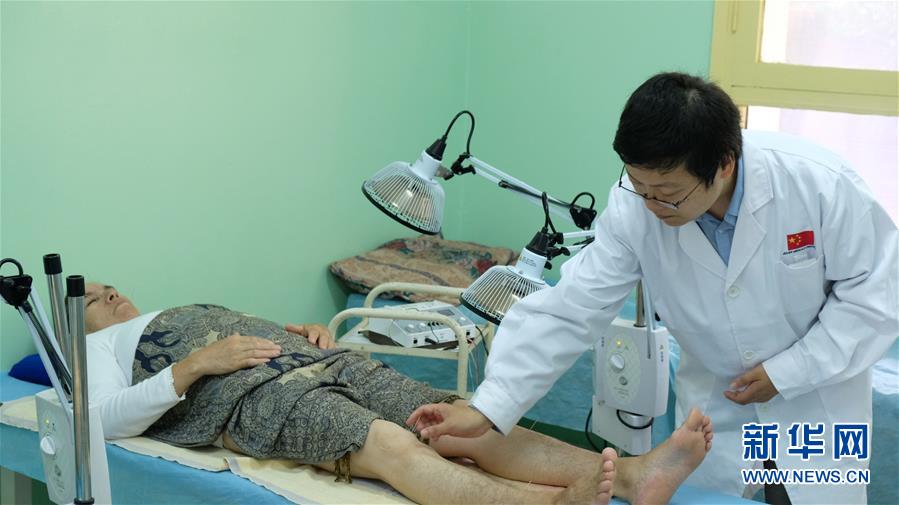 8月5日,在摩洛哥穆罕默迪耶,中国援摩洛哥医疗队穆罕默迪耶分队队长庄潇君为病人进行针灸治疗。 新华社记者 陈斌杰 摄