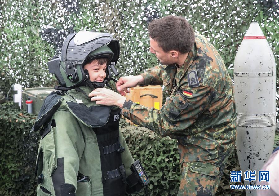 8月18日,在德国首都柏林,一名男孩试穿军事装备。新华社记者 单宇琦 摄