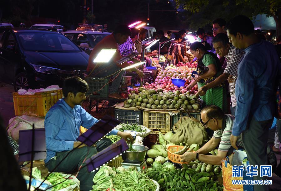 8月18日晚,在印度首都新德里,人们在“星期天市场”购买蔬菜。 新德里有多处类似“星期天市场”的夜市场,大多在周五至周日的晚间营业。这些夜市场多设置在宽敞的道路两旁,方便人们购物的同时也便于管理。相较于传统商场,这些夜市场不仅商品种类繁多,而且价格便宜,吸引了许多民众前来。 新华社记者 张迺杰 摄