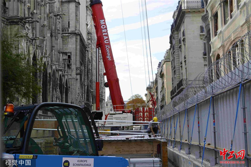当地时间2019年8月19日,法国巴黎,巴黎圣母院维修工程重新启动。巴黎圣母院4月15日突发火灾,屋顶和塔尖被烧毁。由于圣母院被焚毁的建筑材料中所含的大量铅随着大火散播,导致铅污染。维修工程于7月底暂停,以便清除铅污染。  李洋(法国分社)/中新社/视觉中国