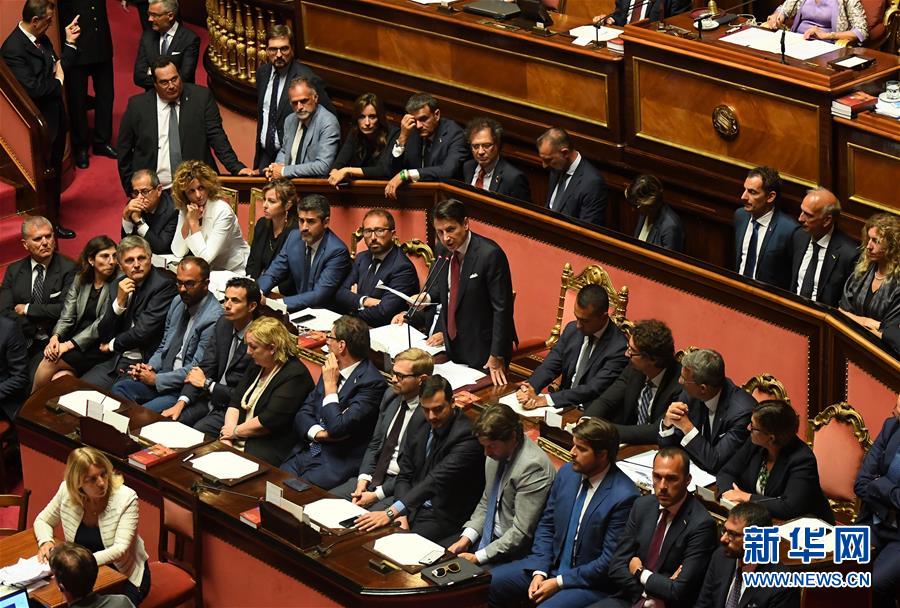 8月20日,在意大利罗马,意大利总理孔特在参议院发表讲话。 孔特20日下午在参议院发表讲话,宣布将辞去总理一职。 新华社发(阿尔贝托·林格里亚 摄)