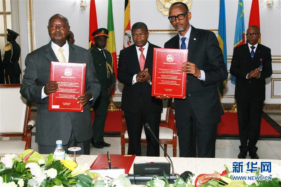8月21日,在安哥拉首都罗安达,乌干达总统穆塞韦尼(前左)和卢旺达总统卡加梅(前右)展示谅解备忘录。 乌干达总统穆塞韦尼和卢旺达总统卡加梅21日在安哥拉首都罗安达签署了一份谅解备忘录,标志这两个东非国家将停止对抗,结束两国间紧张关系。 新华社发(弗郎西斯科·密乌多 摄)