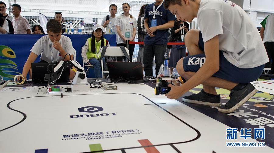 8月21日,来自俄罗斯的选手进行赛前准备。 世界机器人大赛冠军赛与北京2019世界机器人大会同期举行。世界机器人大赛被誉为机器人界的“奥运会”,今年共设BCI脑控机器人大赛、共融机器人挑战赛、机器人工业设计大赛、青少年机器人设计大赛四大类赛事。大赛已在全球举办了多场选拔赛,本次冠军赛有中国和来自俄罗斯、日本、韩国、美国、新加坡、墨西哥、菲律宾等10余个国家和地区的1000余支队伍参赛。 新华社记者李欣摄