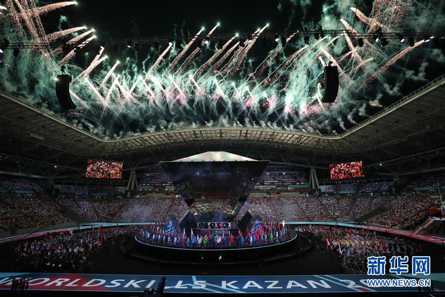 这是8月22日在俄罗斯喀山体育场拍摄的第45届世界技能大赛开幕式现场。 第45届世界技能大赛22日在俄罗斯鞑靼斯坦共和国首府喀山开幕,中国代表团的63名参赛选手将参加全部项目的比赛,向世界展示“大国工匠”的风采。 本届世界技能大赛将持续至27日,来自世界技能组织69个成员国家和地区的1355名选手将在6大类56个项目上展开竞技。 新华社记者 鲁金博 摄