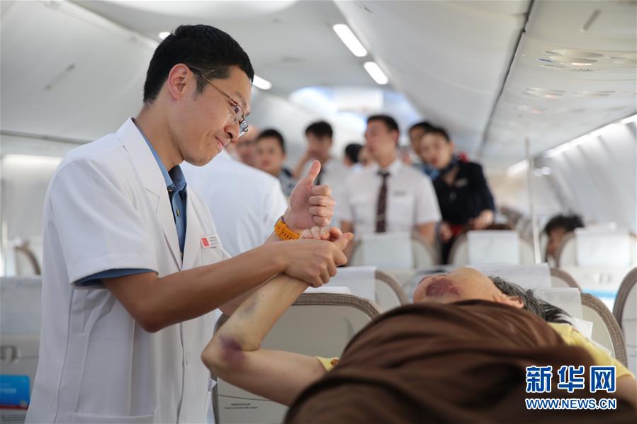 8月23日,在老挝万象,一名中方医护人员在飞机上与受伤的中国游客互动。新华社发(熊天泽 摄)