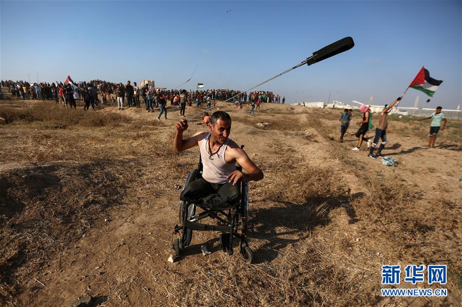8月23日,在加沙地带与以色列交界地区,巴勒斯坦示威者向以色列士兵投掷石块。