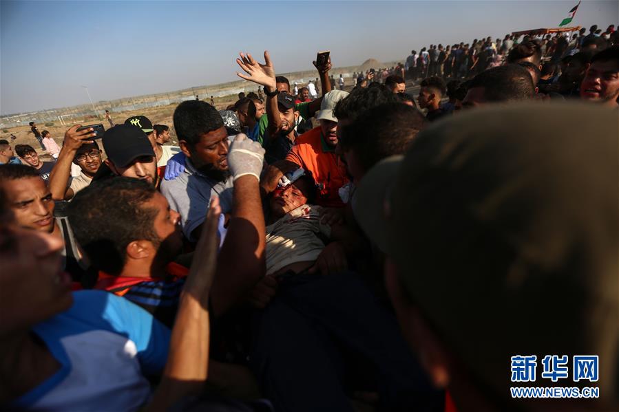 8月23日,在加沙地带与以色列交界地区,巴勒斯坦医务人员转移一名伤者。新华社发