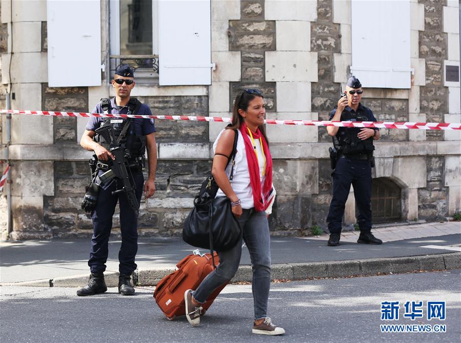 8月23日,在法国比亚里茨,警察在街上警戒。新华社记者高静摄