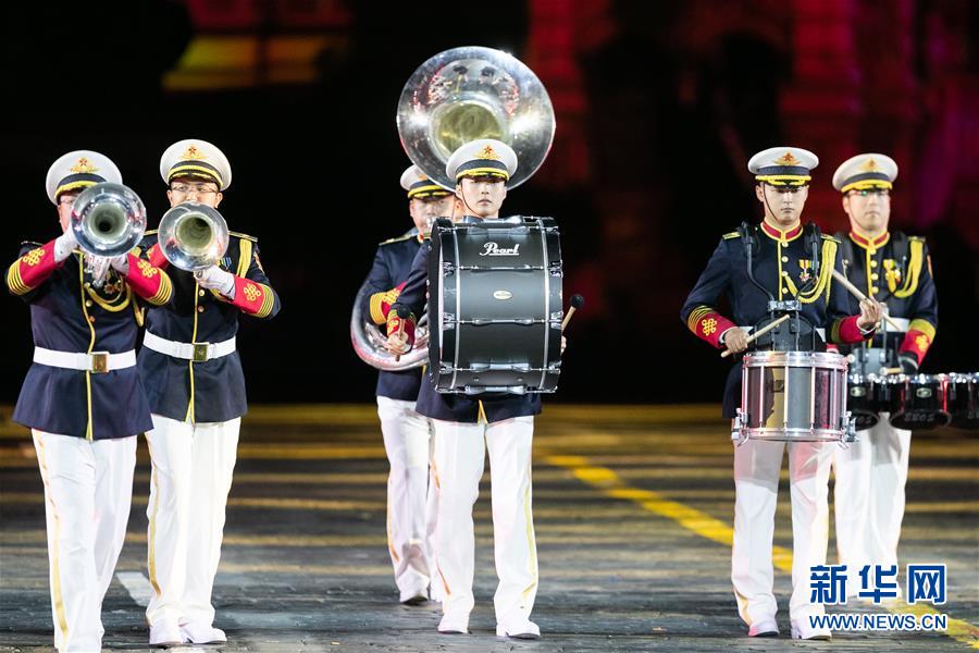 8月23日,在俄罗斯首都莫斯科,中国人民解放军军乐团在军乐节上演出。 俄罗斯“救世主塔楼”国际军乐节23日晚在莫斯科红场开幕。中国人民解放军军乐团参加此次军乐节演出。 新华社记者白雪骐摄