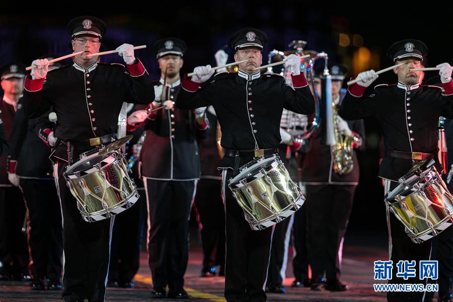 8月23日,在俄罗斯莫斯科,来自挪威的乐团在军乐节上表演。 俄罗斯“救世主塔楼”国际军乐节23日晚在莫斯科红场开幕,将持续至9月1日。 新华社记者白雪骐摄