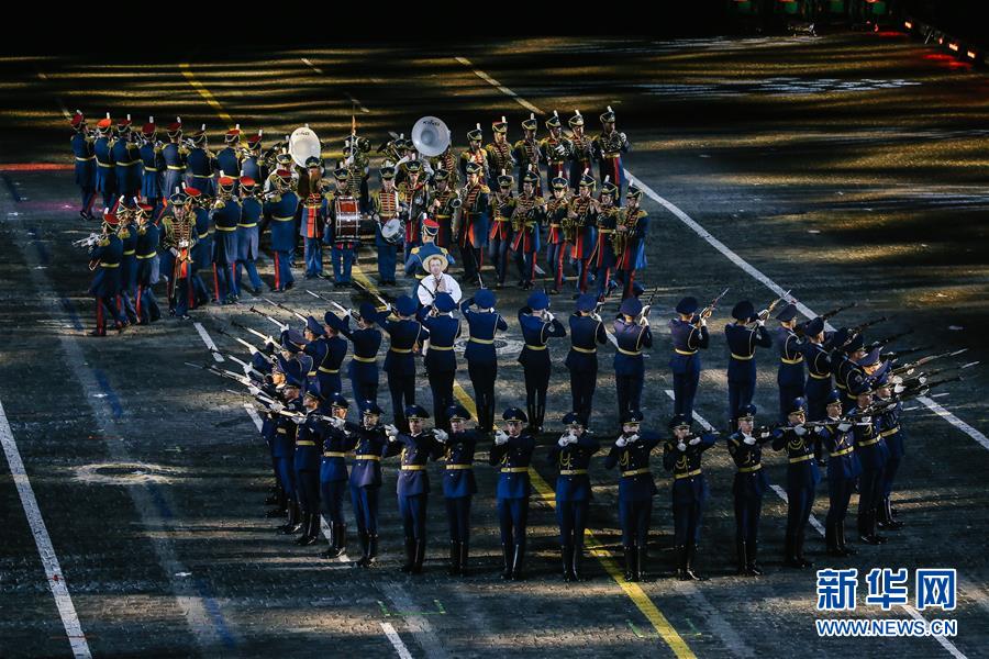 8月23日,在俄罗斯莫斯科,来自白俄罗斯的乐团在军乐节上表演。 俄罗斯“救世主塔楼”国际军乐节23日晚在莫斯科红场开幕,将持续至9月1日。 新华社发(叶甫盖尼·西尼岑摄)
